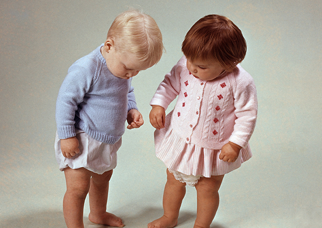 Home / Classic Collection, Page 122, 10420816. Two little children, in a studio shot, little girl dressed in a pink cardigan, little boy dressed in a blue cardigan, both looking at something on the floor. 1967.